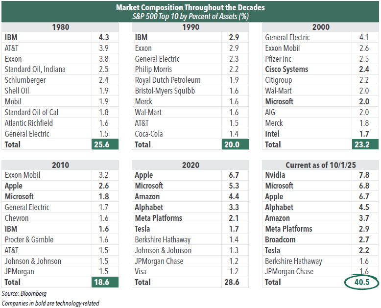 Perhaps the most striking change is the growing concentration of the Index. In 1980, 1990, 2000, and 2010, the top 10 stocks comprised approximately 20% of the S&P 500. Today, that figure has climbed to roughly 40%, surpassing even the high concentration level seen during the Dot-Com bubble.