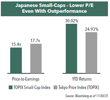 Corporate governance reforms should also positively affect small domestic Japanese companies, driven by activist investor activity who seek to improve capital efficiency and enhance shareholder value, leading to an increase in equity prices. In addition, although small-caps in Japan have outperformed their larger peers in 2025, their valuations remain discounted on price-to-earnings and price-tobook metrics compared to large companies. We anticipate as investors realize the attractiveness of certain domestic small companies in Japan, this discount could narrow.