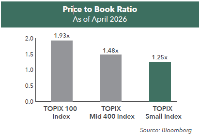 » Japanese small-cap equities trade at an attractive price to book and trade at a discount of more than 30% relative to large-cap peers.