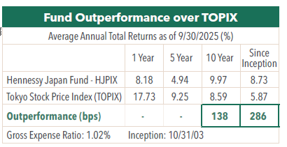 Over the past 10 years through, September 30, 2025, the Fund (HJPIX) provided strong excess returns, delivering an alpha of 3.07 relative to the Tokyo Stock Price Index (TOPIX).