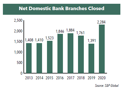 Federal Deposit Insurance Corporation (FDIC) bank branches have dwindled from a high of 85,566 branches as of year-end 2009 to 74,935 branches in 2020. Over the last seven years, branch closures have consistently grown. We expect this trend to continue through the end of the decade and ultimately serve as a margin tailwind for banks able to successfully transition online.
